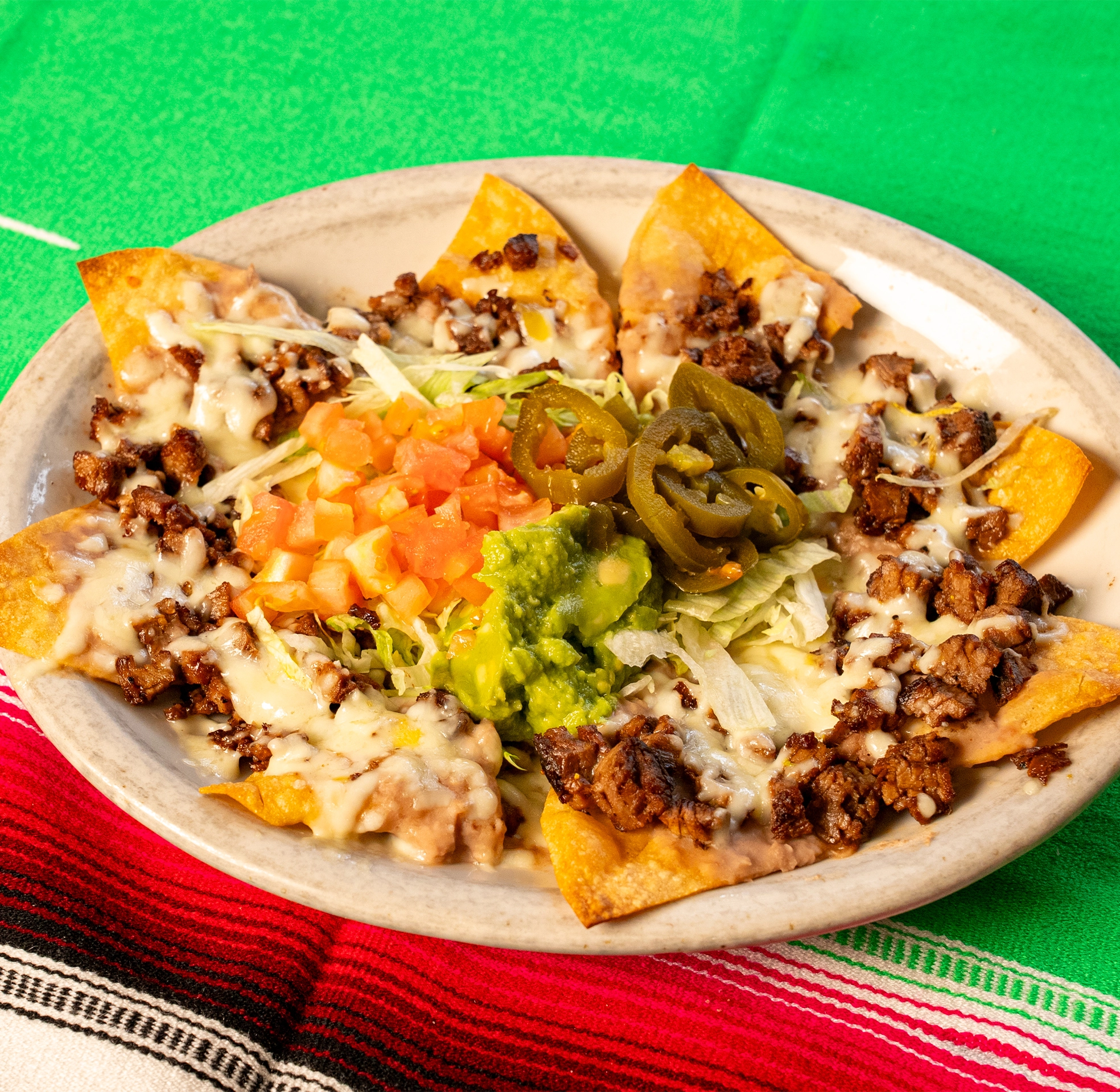 Cheese, Beans, meat, guacamole, sour cream & jalapeƱos